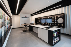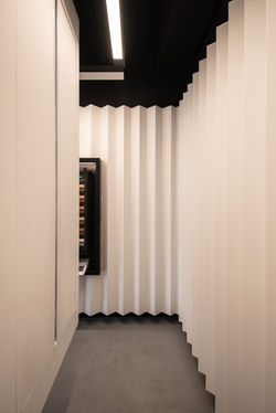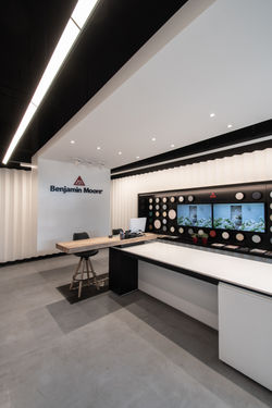 Primer local comercial de Benjamin Moore en Chile. El showroom pretende mostrar todas las pinturas y acabados disponibles en el mercado chileno, proponiendo un diseño flexible que se adapte a posibles cambios de productos escogidos para ser exhibidos. El revestimiento de yeso cartón de los muros perimetrales permite hacer un trabajo con pintura que muestre una gradiente de tonos en escala de grises. El local se encuentra ubicado en Las Condes Design y es el primer Showroom de la marca en el país.